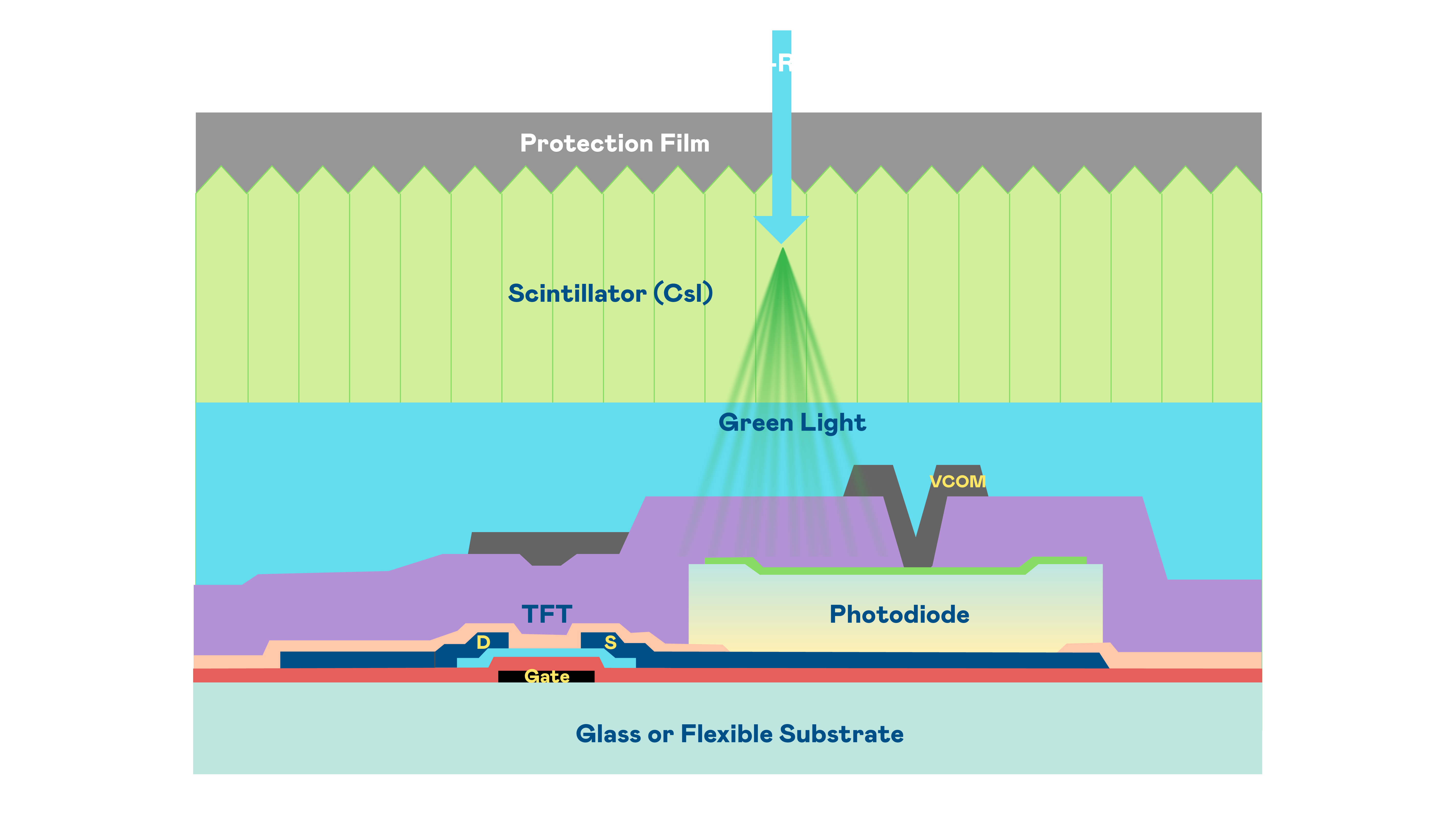 金沙9001cc的X光影像感測陣列使用薄膜電晶體 (TFT) 作為每個像素的讀取開關,搭配光電二極體(Photodiode)的光電轉換元件,用以感測X光影像訊號。